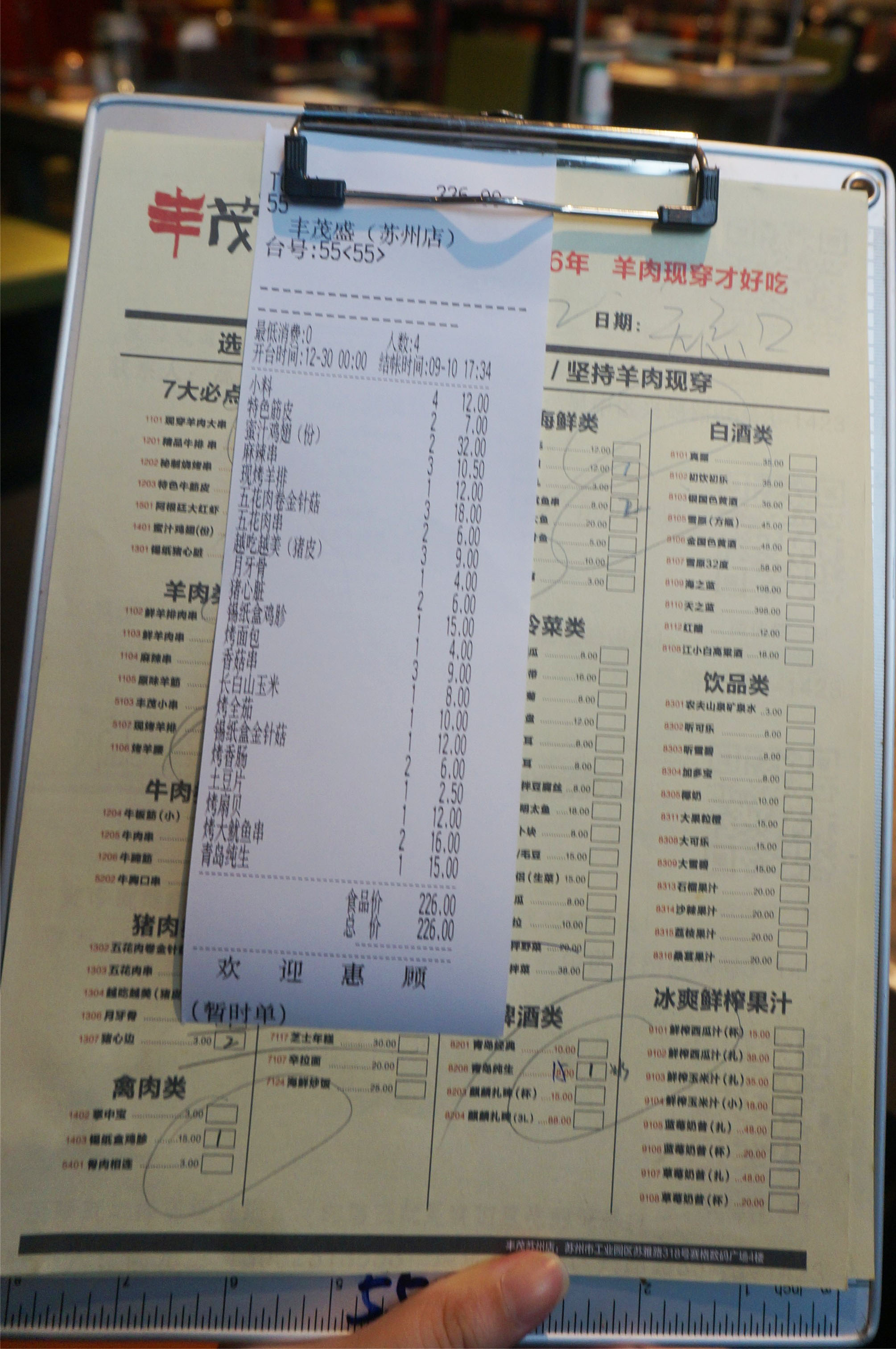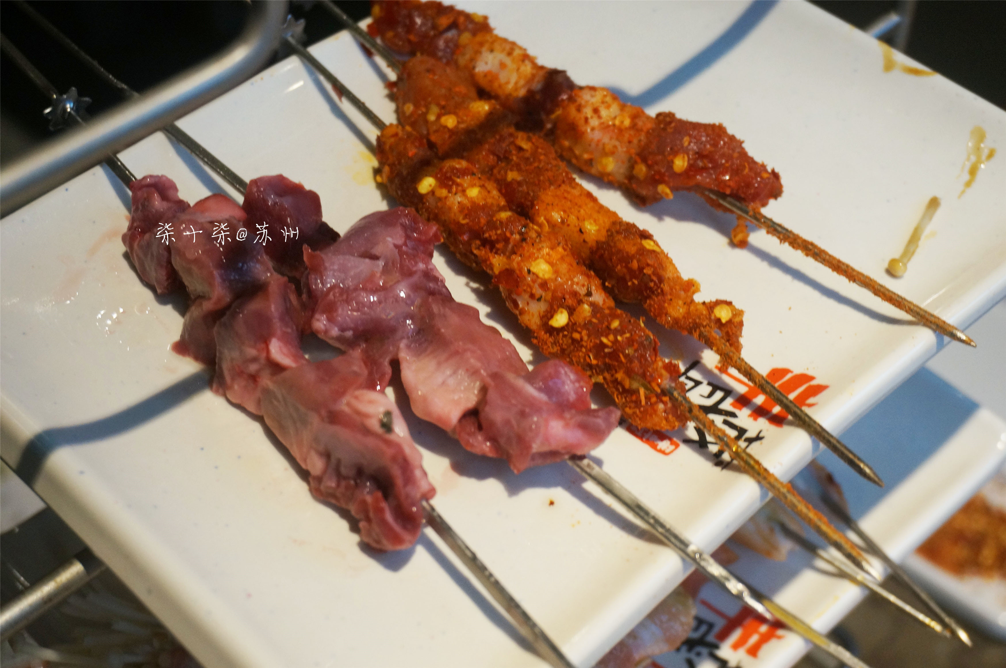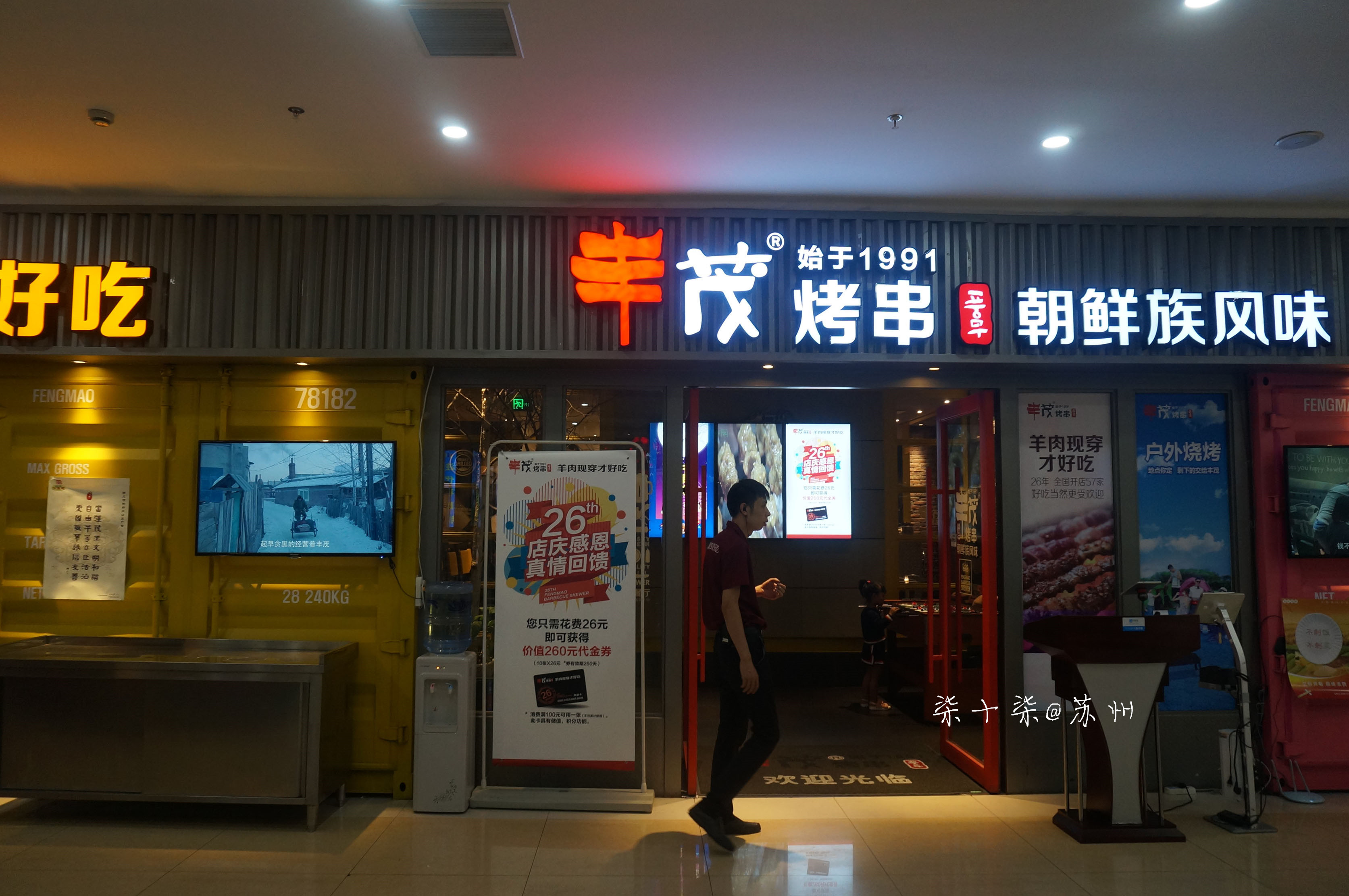 ------魔都吃货の食在苏州----- 皮皮说想吃丰茂,上海就有这家店,不过做攻略的时候发觉苏州也有,吃苏州的也无妨呀。 从摩天轮乐园直接打车到赛格广场的,到的时间稍早些,直接被带位到靠窗的位置,店内环境颜色鲜艳,没有那种烧烤的油烟感,换进挺惬意哒。 光是酱料就有四种,感受到了店家的用心,可以配合各种的口味需求,阿拉就喜欢撒点孜然吃肉的原味。 点了蛮多串烤的,麻辣串、羊排、猪皮、月牙骨、香肠、筋皮、五花肉、五花肉卷金针菇、猪心脏、面包、香菇、土豆等,现烤的确实都挺好吃的,特别是肉肉。 蜜汁鸡翅16米/4个,大家都喜欢吃鸡翅,所以要了2份,是直接烤完上来的,个人喜欢鸡皮脆脆的那种,这个就是软软的像微波的,无爱。 锡纸盒金针菇12米,也不推荐,金针菇不够入味,喜欢放很多蒜、豉油之类的东西提味,这个偏清淡了。 锡纸盒鸡肫15米,撒了蛮多辣椒的,是我不能承受的辣度,鸡肫本身挺有嚼劲滴,也可以说有点老。 烤大鱿鱼串8米,整条的鱿鱼剖开烤制的,有刷酱料,鱿鱼挺嫩的,就是吃香会难看一点,因为大片。 长白山玉米8米,原本是想吃烤玉米的,没想到上来的是蒸的,考虑试图烤一下,感觉太麻烦放弃了。