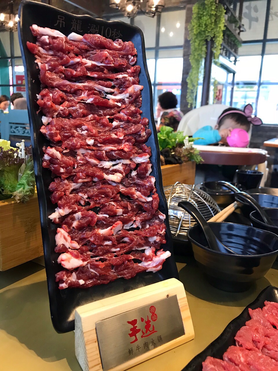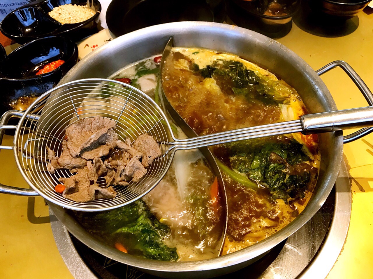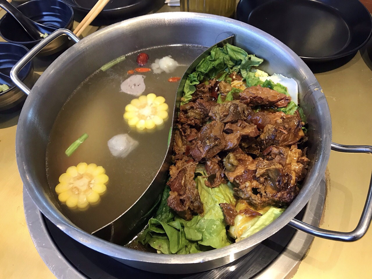 在柏威年店吃出了感情,来这里再续前缘 ✨特意选了上次错过的招牌的牛腩鸳鸯锅,一半清汤一半秘制牛腩,都是大块大块的软烂香浓的牛腩肉真过瘾啊,我觉得这牛腩是他家区别于其它的特色!推荐点这个锅底! ✨点给老妈的芋泥老妈给了好评!饮品点酸梅汤吧,那个什么雪梨茉莉,马蹄神马的味道极其一般不点也罢,牛肉干是5分干的那种,再油炸一下,大概要等10几分钟。 ✨机场万达店的面积比柏威年店小很多,服务跟柏威年一样特别赞!有高大上的儿童餐椅