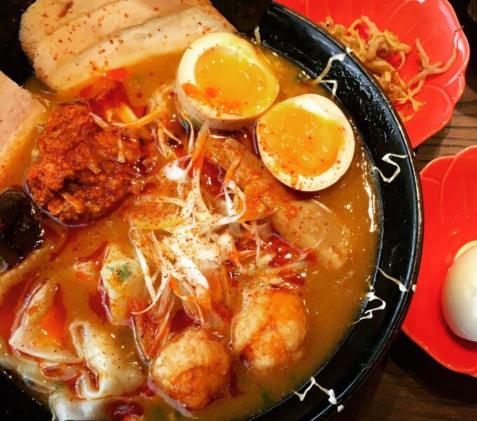 这家店在这个环境里显得有些格格不入,很安静的吃饭地方,特别适合我这种要吃夜宵又不喜欢吵闹环境的人!这家店东西不多,主要就是一些小吃和拉面,有一张纸条可以选择拉面的口味,我们选的是all in,东西超多很合算。还有免费的小菜和煮鸡蛋,鸡蛋可以无休无止的吃下去