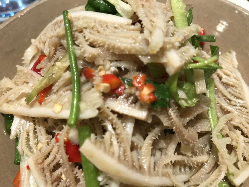 挺好吃的。金沙是咸蛋黄,裹着豆腐虾仁杂菜粒,稠稠的,推荐。 凉拌牛百叶:中规中矩