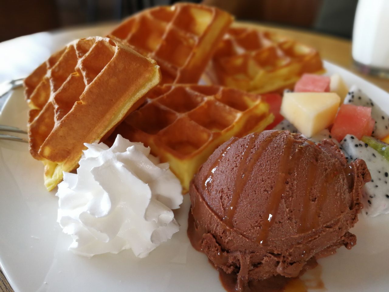 ...图,正好想尝尝,结果上来的是华夫饼,虽然也很好吃,但是华夫饼比真正的松饼量大多了,最后吃的太撑