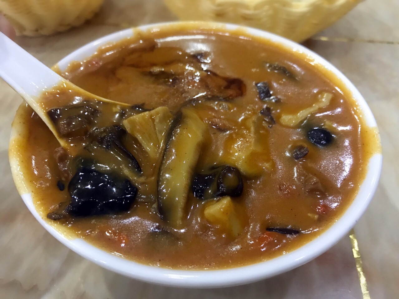 浓稠的口感和胡椒、陈醋搭配起来绝对是重口,牛肉、香菇、面筋、木耳、枸杞加入其中,营养丰富又好吃...