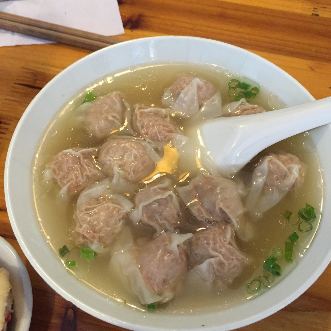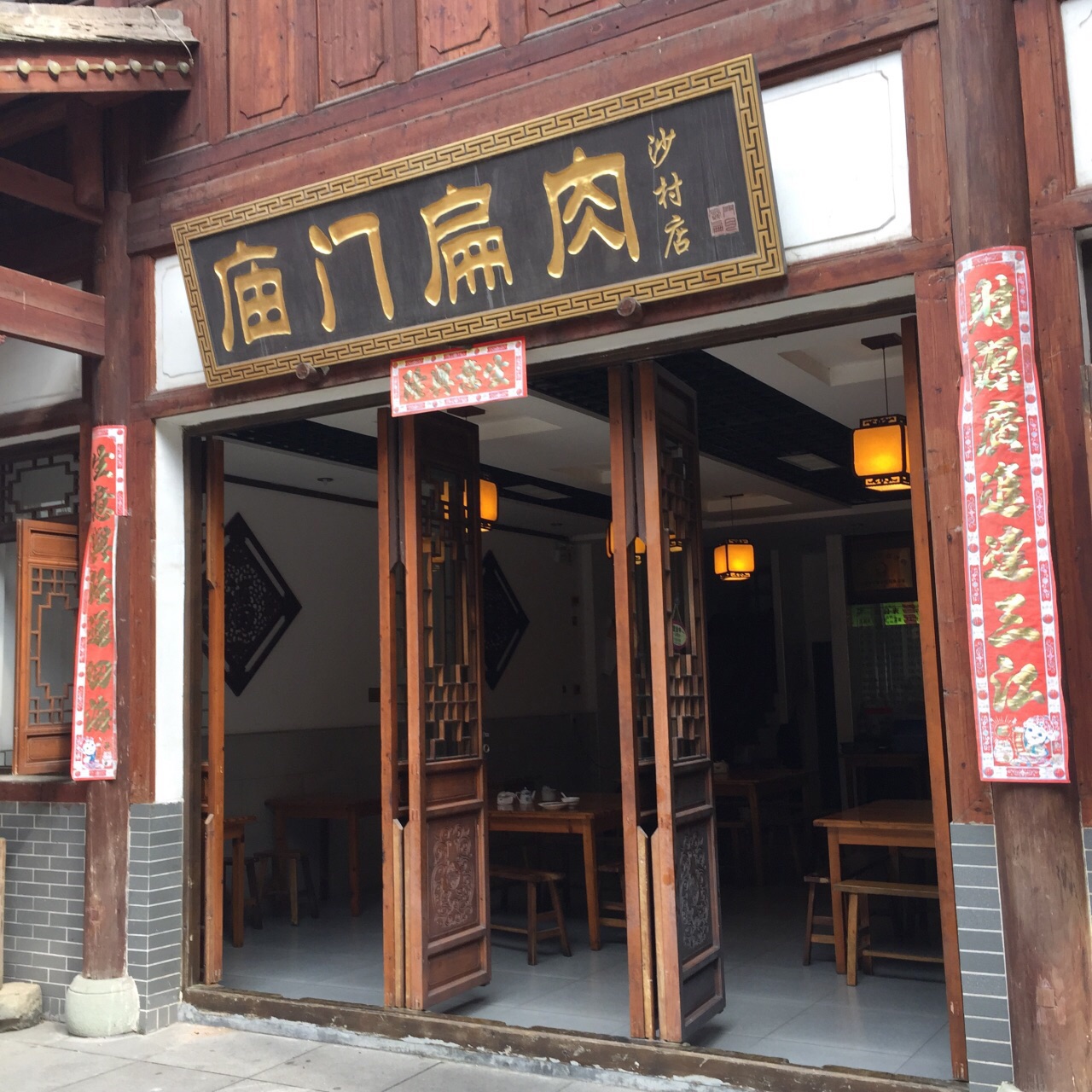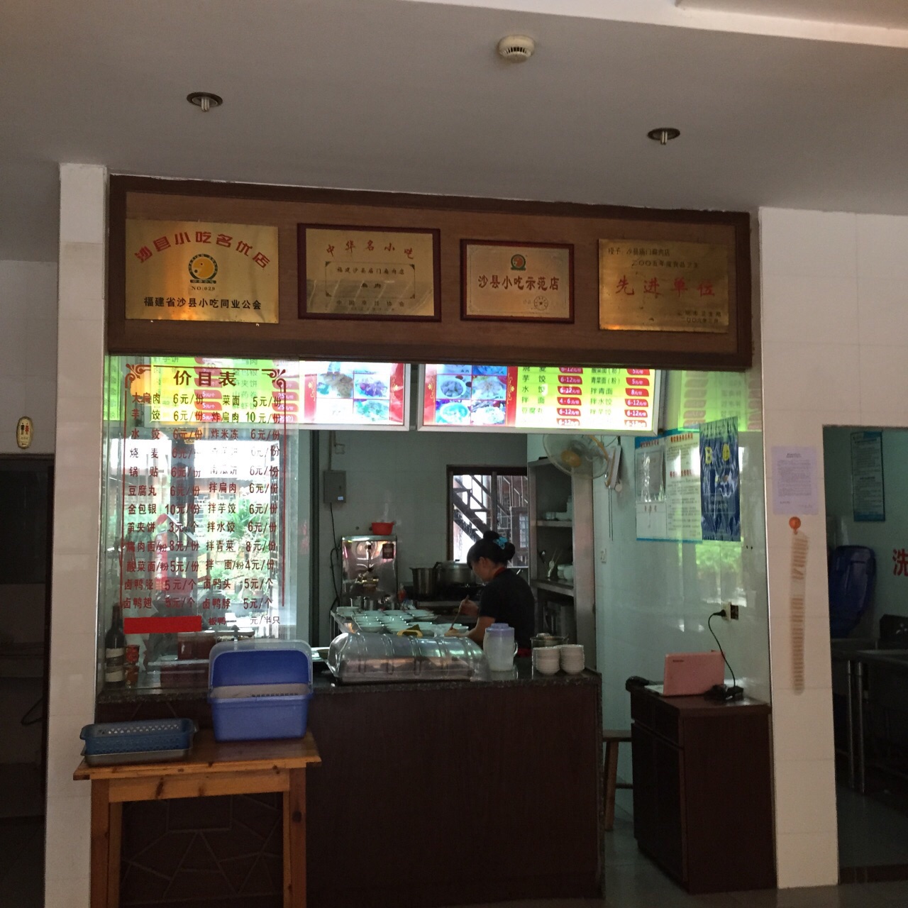 这店在广场右手边的一条路里面,庙门扁肉四个大字的牌匾大气!店里里也装修的很不错,仿古的桌椅,好大的一个店铺里,就我一个客人! 一份扁肉,相对于之前吃的扁食,这家的扁肉里面的肉馅有点脆弹,不是平时软烂的肉馅口感,应该是捶打的原因,挺好吃的^_^,笋夹饼也好吃,主要是里面的酸笋好吃^_^ 小吃城里比较不错的店铺,推荐^_^