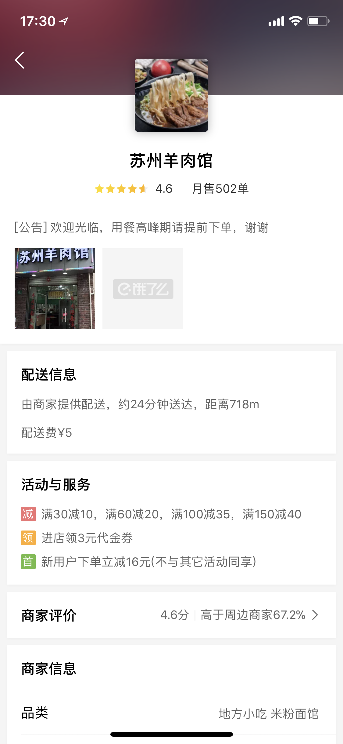 用外卖APP点了这家的外卖~ 服务还可以吧,送餐也算准时,没有等很久~ 环境不是很清楚,因为没有堂吃~ 送来的食物包装略一般,不过也没有出现漏洒的情况,还不错~ 点了这家的红烧羊肉(中锅),还加了份羊血,量还可以吧,不多不少~ 味道也不错,羊肉很酥嫩,好吃~ 不过羊血一般,不是本人吃到过最好吃的羊血~ 整体还不错的外卖餐厅~