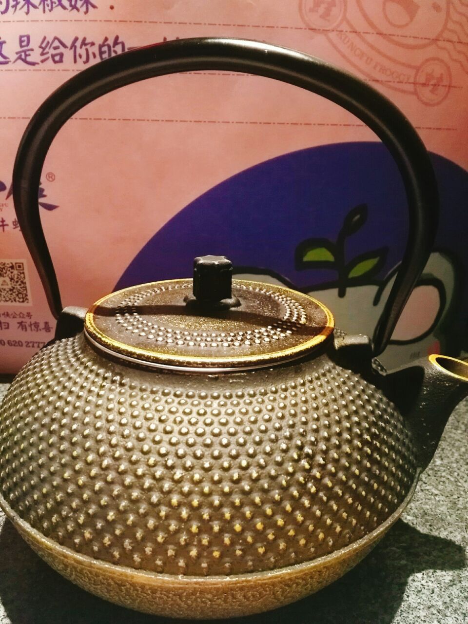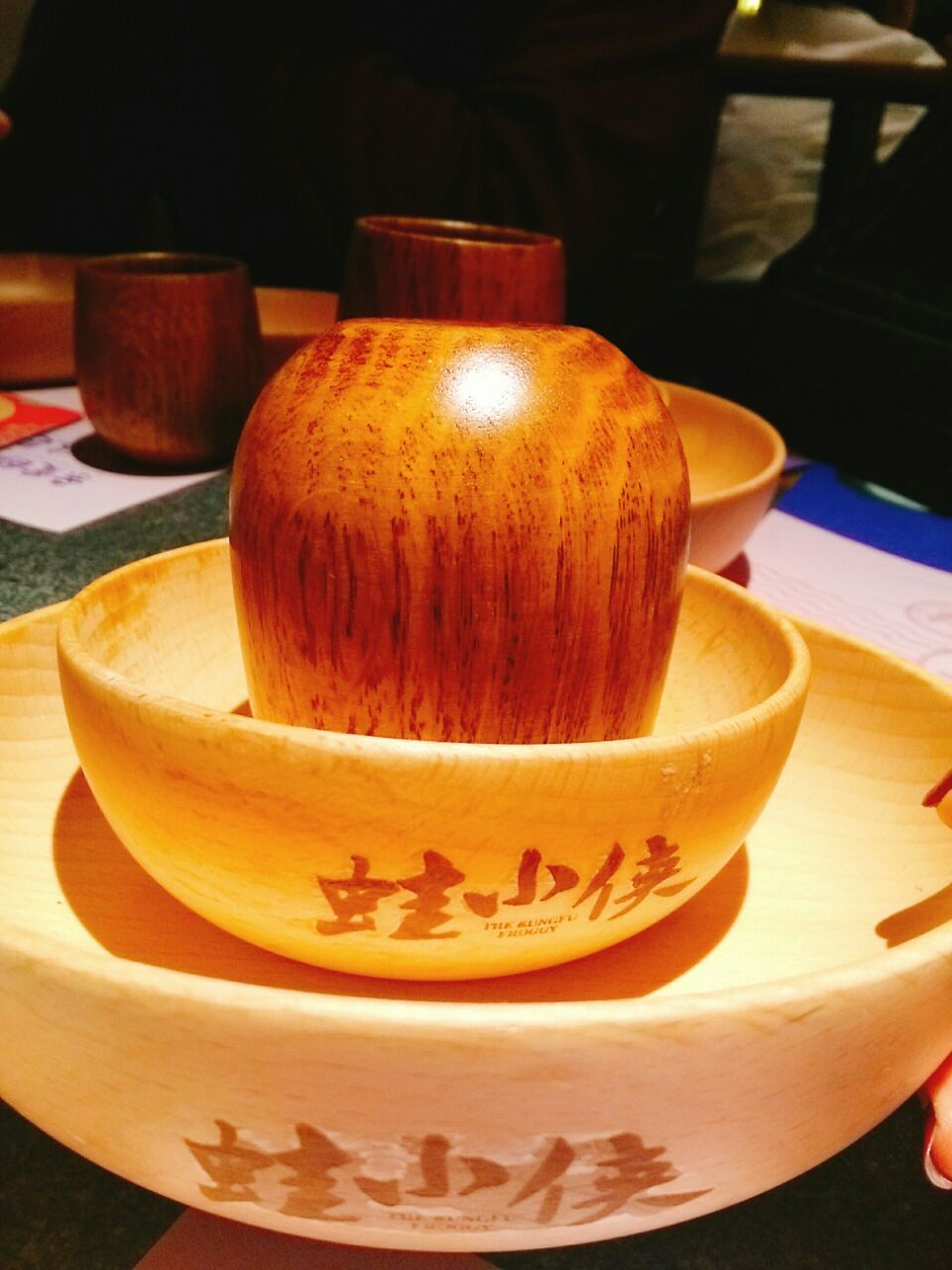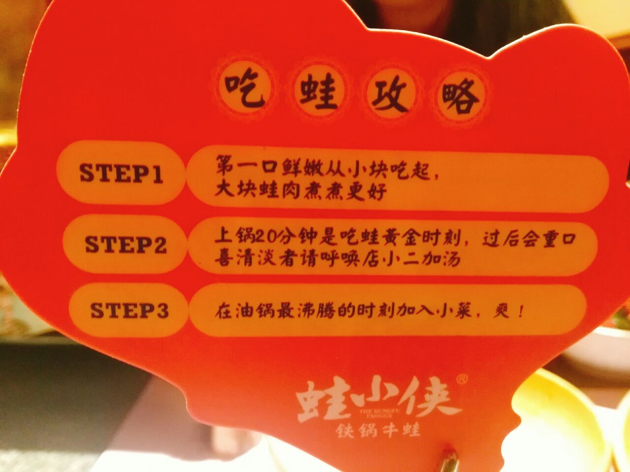 大融城四楼~门口有只戴斗笠滴小蛤蟆~每次都排队人气呱呱滴~六点半到的拍了四十分钟终于得以进去~空间不大 桌与桌之间挨得很近~朋友不太能吃辣点了一个青椒紫苏口味的 量还行 蛙是小块的先过油的 配菜里面的紫苏叶味道很浓厚 上来就可以吃 味道真的很不错~吃的差不多就可以+配菜了~配菜六元一份 有点小贵 数量不多很袖珍~黑凤爪味道不错但是量太少 看起来总共能有两只爪剁吧剁吧 底下一层还全铺着黄瓜打底~杨梅 不错 凉凉的 也是紫苏搭配 清口解腻~那个耙耙就是没有馅的汤圆 有点噎人~烤牛蛙不错 第一次吃 挺香~可笑可乐 古法熬制的酸梅汤 凉凉的喝一口很舒服~饭间不时有服务小哥过来帮忙翻锅底 加汤 很是不错~等有时间下次去再挑战一下麻辣口味的小蛙~哈哈哈~甚是刺激啊~值得期待
