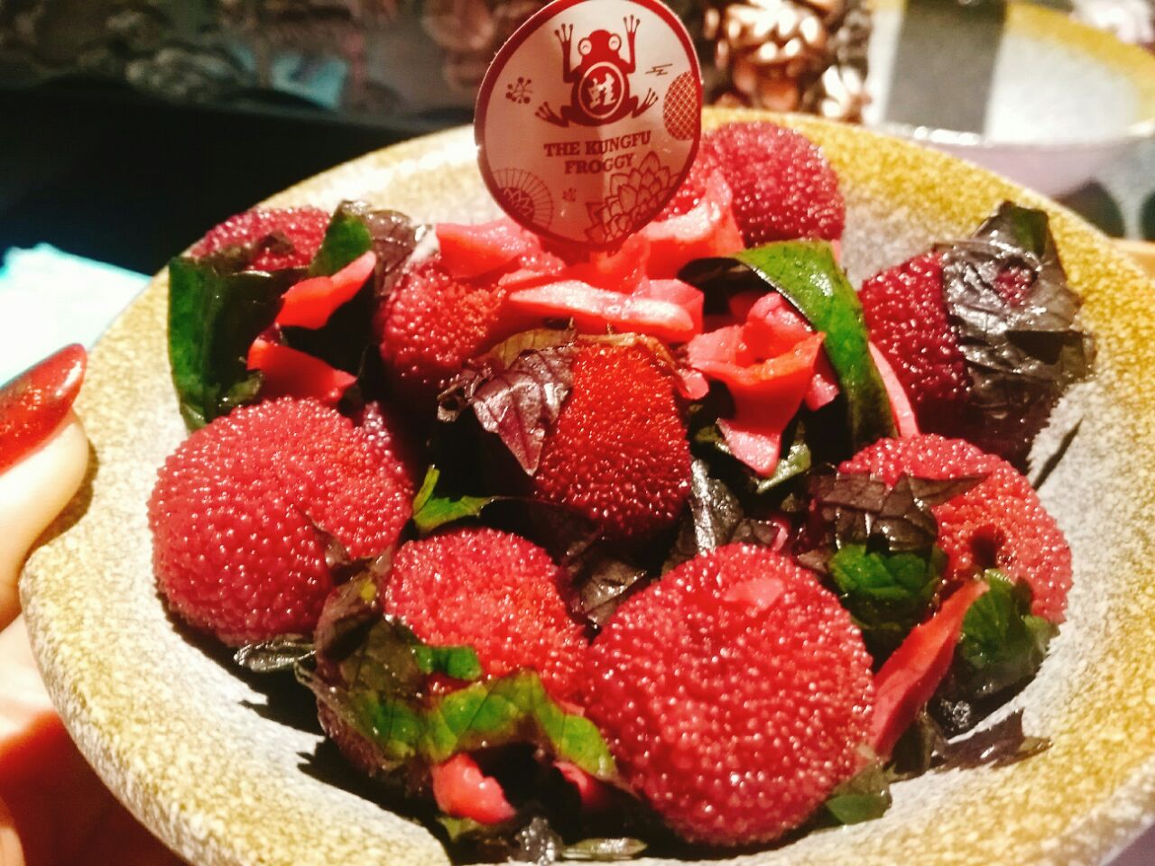 杨梅 不错 凉凉的 也是紫苏搭配 清口解腻~等有时间下次去再挑战一下麻辣口味的小蛙~甚是刺激啊