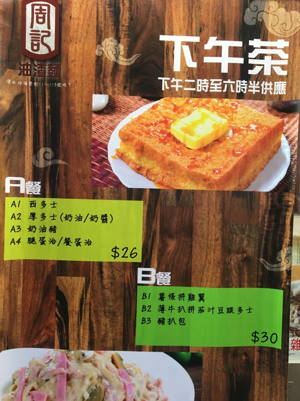 来到深水埗,就发现很多家的餐厅都叫做油渣面,这个在香港别的地方还真没见过,而周记油渣粉面在深水埗就算是相当有名的油渣面店了。看隔壁桌吃的油渣面,面条就与众不同,像筷子般粗细,有点像云南的饵块。不过我只是来吃一下简单的下午茶,要了一个西多士,算是普通正常。下一次再过来尝一下它的油渣面,看看为什么会这么有名。