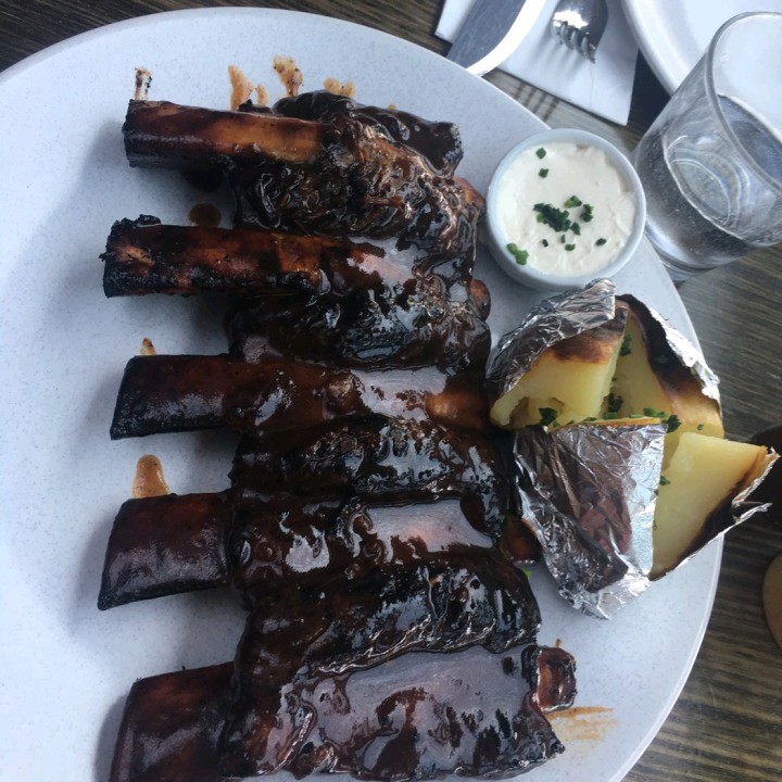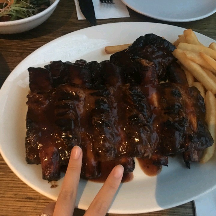 猪肋排非常的大,一份一家三口吃都够了,还配了不少的薯条,里面的海鲜色拉不错,价格也便宜,咖啡做的可以猪肋排非常的大,一份一家三口吃都够了,还配了不少的薯条,里面的海鲜色拉不错,价格也便宜,咖啡做的可以,拉花很漂亮,红酒有点小贵。