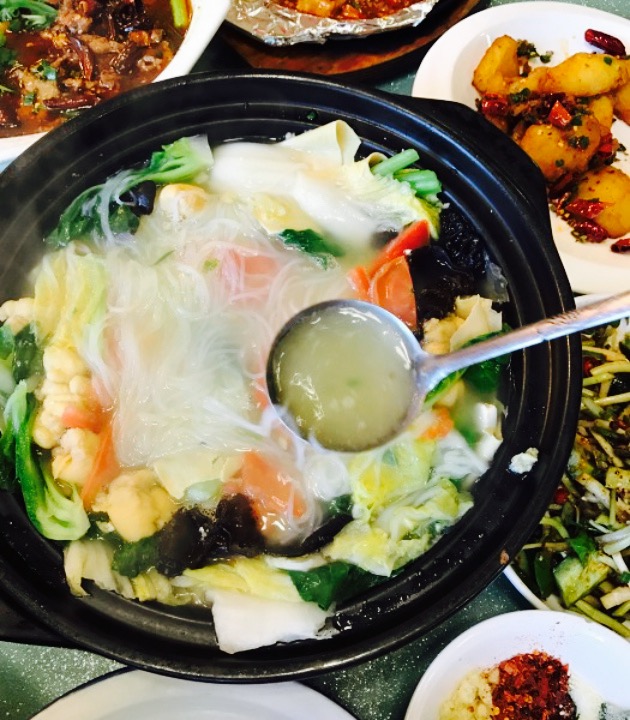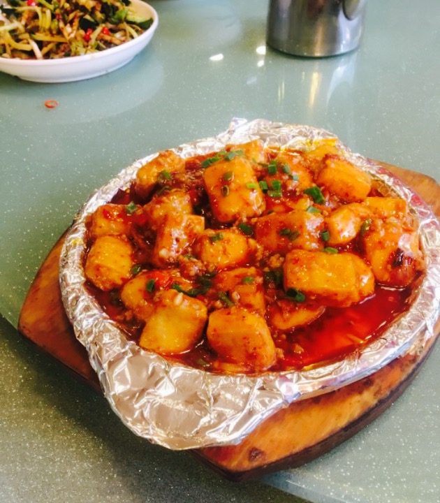 大酒店附近100米处的店,看上去有点农家菜的样子。饭点客人还挺多的,但是菜式基本都是辣的。同事们都不吃辣,能点的菜也是所剩无几。总共就点了千叶豆腐,铁板牛肉,杂锅和筒蒿汤。菜量是真的大,四个人三菜一汤都没要米饭也没吃完。