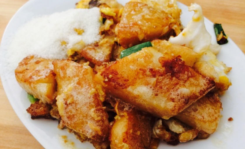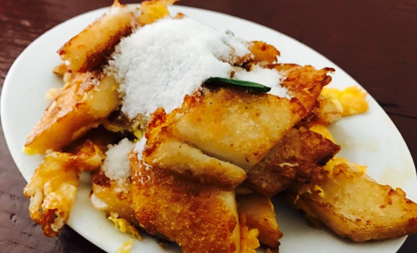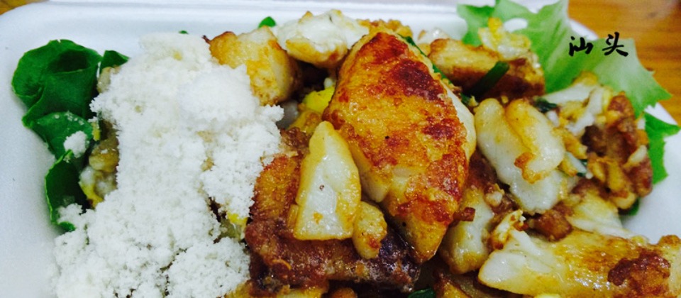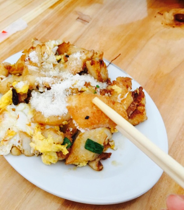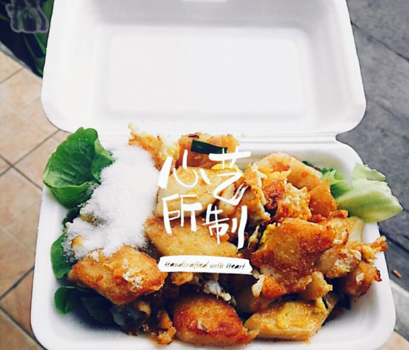 老伯亲自掌勺,他女儿热情招呼客人并打打下手。点了斋炒糕粿,端上来时老板还叮嘱说小心烫,又另外给了个小碟子说可以帮小朋友把糕粿夹小块点免得小朋友烫嘴,挺亲切的。一份糕粿的分量比较小,小孩子一个人吃完了,10元一份,吃得出一点点辣,趁热蘸糖粉吃比较爽口。另外又打包了一份带回家,打包的话糖粉会另外装在小袋子里,避免了带回家时融掉了。