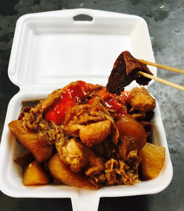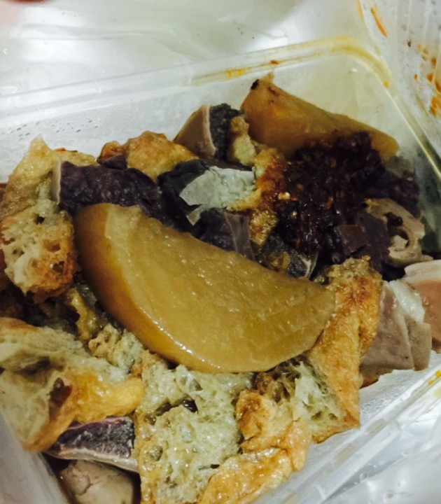 从来没吃过大V们总是挂在嘴边的阿婆牛杂,不过就我所吃的牛杂中感觉,阿叔牛杂不见得会比阿婆差,主要是天天能吃到,除非刮风下雨,所以没兴趣去撞运气,想吃的时候随时过来阿叔这边吃上一碗超赞的牛杂。阿叔牛杂其实并不是店名,阿叔每天四点准时出车在胜佳超市这边上的坡上卖牛杂,在这里至少有十几年了吧,记得2000年我在这边工作的时候,就看到了,至到我13年离职,到现在还依然在,确实很久时间罗。阿叔从来不提早出档,记得之前问过。阿叔说要煮这么久牛杂才会好吃,早了做不好,不好卖给客人。牛杂带肺是15一碗,不要肺30元一碗,萝卜面筋5元一碗,如果两样都要,阿叔会给你一个饭盒,然后将东西先装碗里再倒进来,碗里也是装着满满当当的,都可以溢出来,这个价确实比早几年贵了很多了,以前还有一串一串卖,现在直接一碗罗。只是味道依旧很赞,牛杂煮得超级美味,白萝卜也很进味儿。阿叔是一个很有性格的人,很敢说呢,今天看到一个阿婆年纪好大要来买牛杂吃,直接告诉阿婆别吃,说给自己积点福德,劝阿婆这样的身体别吃牛杂,直接不卖也。之后来了一个小姑娘,骑着膜拜上了斜坡推到阿叔的牛杂车前面,阿叔表示不卖给她,明明那个位置单车根本不允许上来的,对方都不下车弄上来,阿叔很生气,说她占着整个道,不用做其他人生意了,不尊重他。哈。很有兴格的大爷。