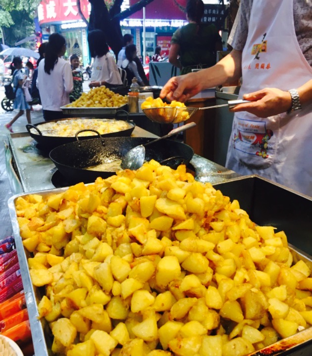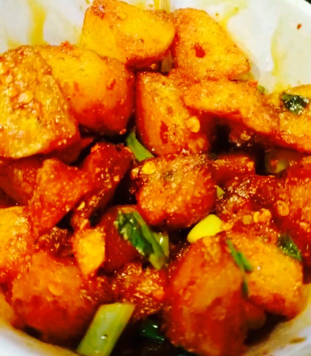 老板娘好配合,我们要拍照还专门把灯给我们开开??,说回洋芋,要了一份打包,老板娘又炸了下来拌,外面脆脆的,里边是面的,拌的味道也好,因此第二天又来店里吃了两份,撑死啊,店里吃的分量感觉比外卖足,推荐,下次还来。