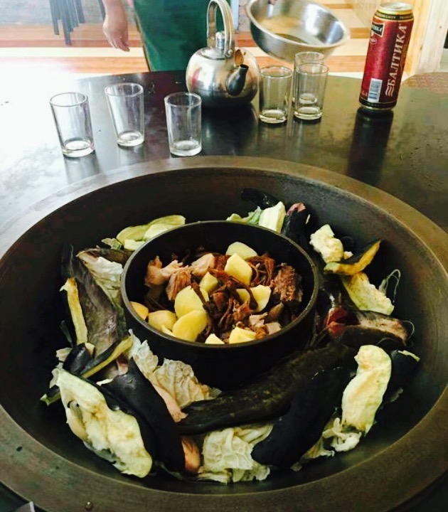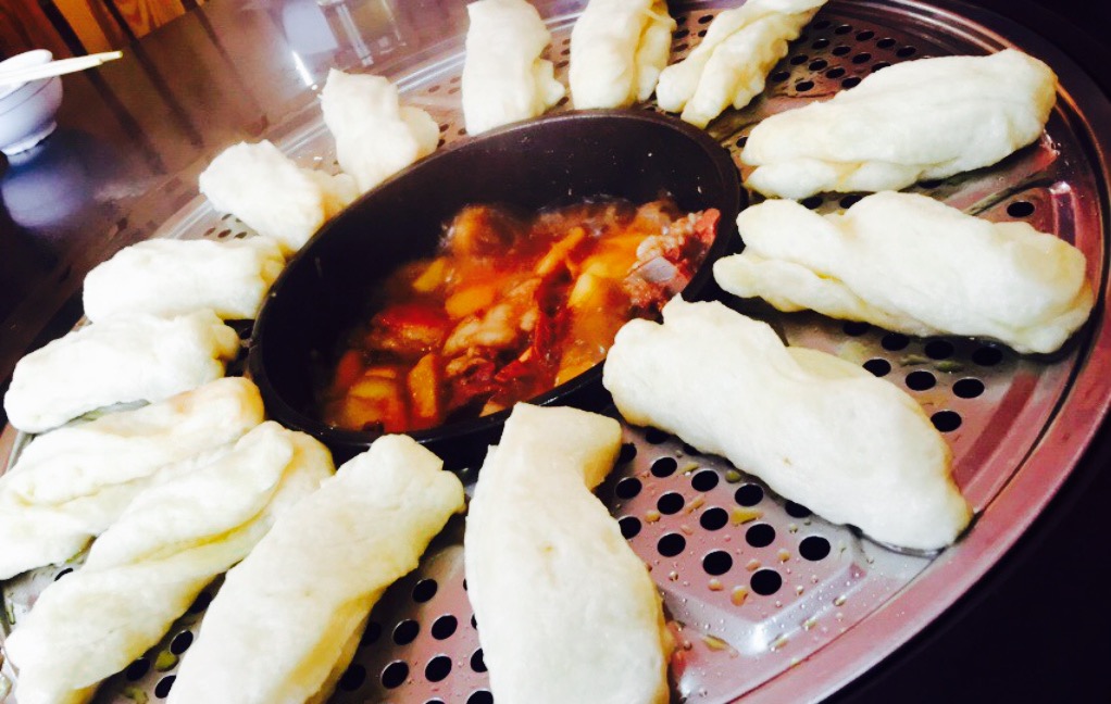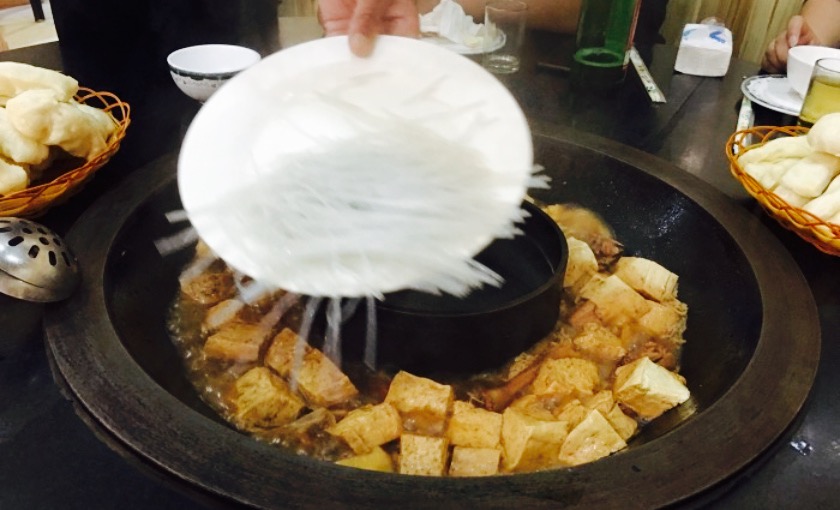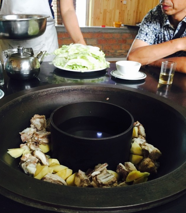 大铁锅很有特点,我们去的时候是夏天,外面下着雨,我居然还有点冷,围着大铁锅吃饭,那叫一个暖和
