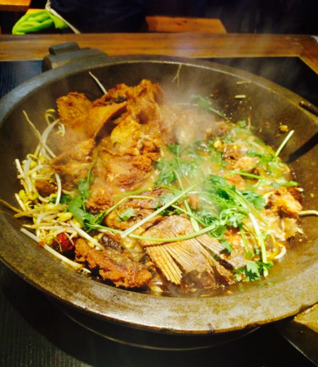 总听朋友说他家好吃,今日终于赶上来一趟。饭馆的装修透露着浓浓的川蜀风格,只是感觉因为是旧楼门市的原因,显得有点陈旧。所谓石锅鱼就是把鱼剁成块,油炸后跟各种配菜一起煮,配菜包括午餐肉,虾,豆芽等。手撕牛肉不错,我们还探讨了一阵肉丝制作的。麻将油麦菜的麻酱属于混调出来的,加了别的东西,味道比较重,本人比较喜欢纯酱的。家常凉菜水平一般,但也不难吃。整体评价中规中矩,还算及格。