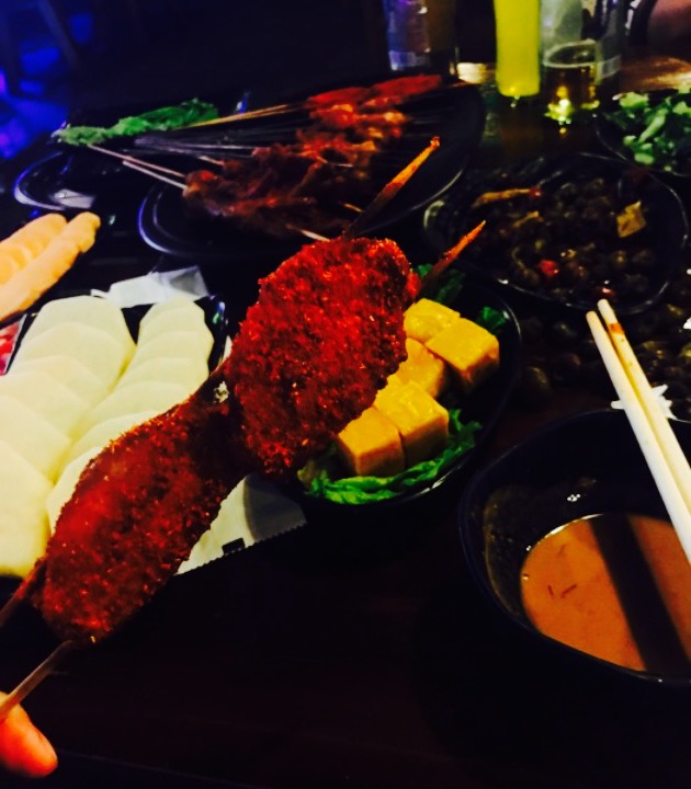 位置还是蛮好找的,距离地铁站很近,朋友说不错就想着试试,装潢风格还是很舒适的,正巧遇上有驻唱,值得一提的是真的很吵,喜欢清净的不建议,火锅烤串集一体,天气热,就弃了火锅了,怎么说呢,炒的蛏子真的很有失水准,一口一吃沙子,生蚝处理的也不行,建议改善啊,烤串的味道中规中矩,肉串小小的,烤玉米但是特别鲜美啊,气氛还是很适合喝酒聚会的,总体不错。