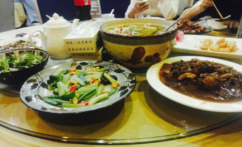 同学聚餐选的这里。饭店其实还挺大的,装潢很喜庆,也比较清新。照片没有刻意拍,毕竟是聚餐,可是还是拍了比较喜欢或者有特点的。#炒虾仁#非常开心的一道菜,虾仁又大又嫩,外面薄薄的一层面粉也爽口。价钱也都不贵,量其实也很多。#水煮牛肉#不是很辣,适合更多人的口味。牛肉很嫩,包心菜也爽口。#松仁玉米#做的也很可口,玉米香甜软糯,都是一勺勺的吃。#红烧牛舌尾#,#酱爆桃仁鸡丁#,#油焖酥鱼#等等,天津本地同学说是特色菜,没尝试过的可以试一试。孜然羊肉做的也挺好吃的,水饺也不错,水分适中。总的来说,是不错的感受。