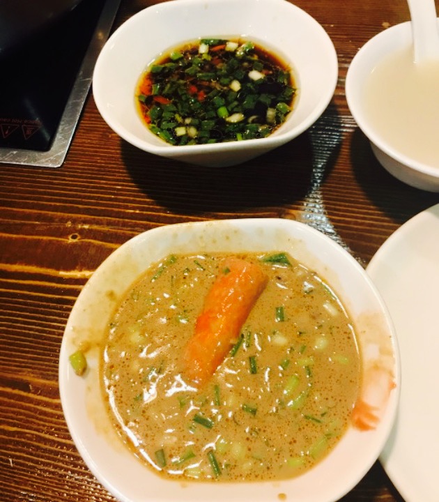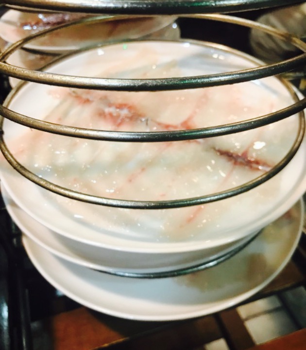 石斑鱼片,这个太赞了薄如纸啊,一共四盘一盘两片,涮一会就能吃了鲜嫩啊配上特色蘸料。值得推荐啊