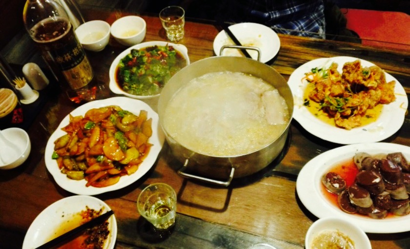 这家闻名已久,总是没有时间,今天跟朋友特意约好了来这边吃,人不少,我们只好在加桌吃。门口还有排队的,下雨了都没见人少,说明这家确实不错,干煸肺子很入味,就是颜色有的人看起来觉得害怕。颜色偏黑。鲈鱼价格经济实惠,貌似只要30块。血肠真的不错,入味。酸菜汤也很赞,味道鲜美。犹豫本人不吃大肠,所以大肠灌肉没吃,不知道怎么,可是朋友都说好吃。我只有看着的份儿。下次还会再来的。推荐。