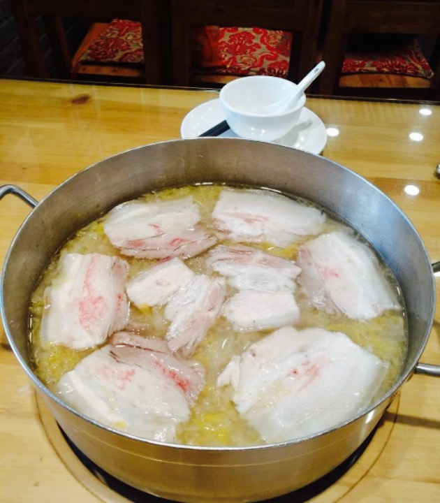 听东北的同事介绍,他们经常去的一家杀猪菜餐馆。然后打车就直接过去了,和司机师傅一说这家店名师傅就晓得了,说做了好多年了。过去的时候已经全是人了,需要等位。然后东北的菜量都非常特别的大我们点了,酸菜汤,猪血,锅包肉,凉菜,大肠和猪内脏,韭菜盒子,雨,炒油麦菜。5个人基本是吃不完的。看到好多人基本也都是打包的。味道真心不错,酸菜和凉菜都很好吃,猪血是特色需要总蒜泥加酱油或辣一起吃。和上海的血口感很不一样。
