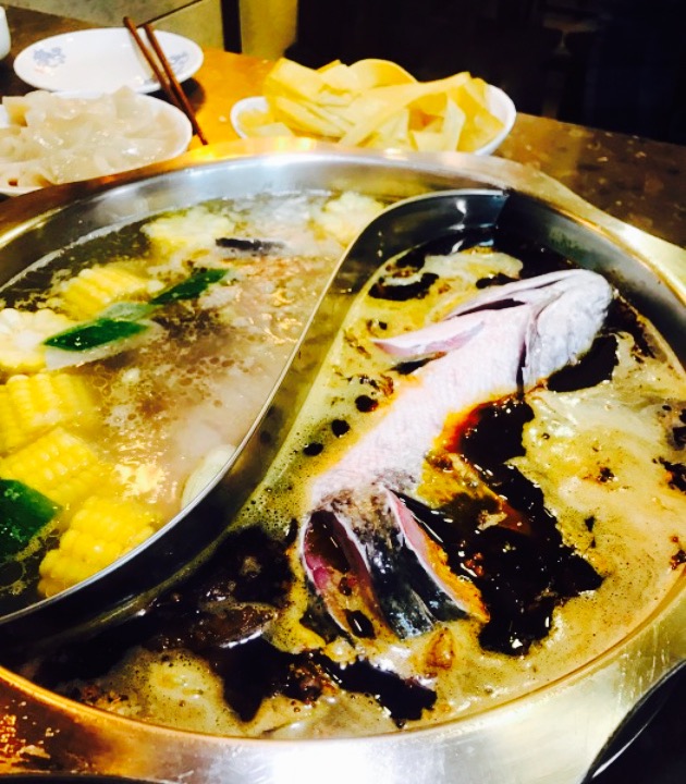 盆友出国前最后一约火锅,在“老妖”推荐的众多火锅中选了这家。酸萝卜麻辣锅底很舒服。问服务生推荐的鱼的品种。不出所料是最贵的江团。鸭血是清新的鸭血。藕片意外惊喜 。连续点了两份。两个人吃了近300。这个服务和环境来看,略贵。可是最后服务员阿姨很热心地帮我们算是团两张代金券划算还是团三张。聊天很开心 。吃的也蛮舒服。但是好像也没有想要再去,抱的期待太高啦(。