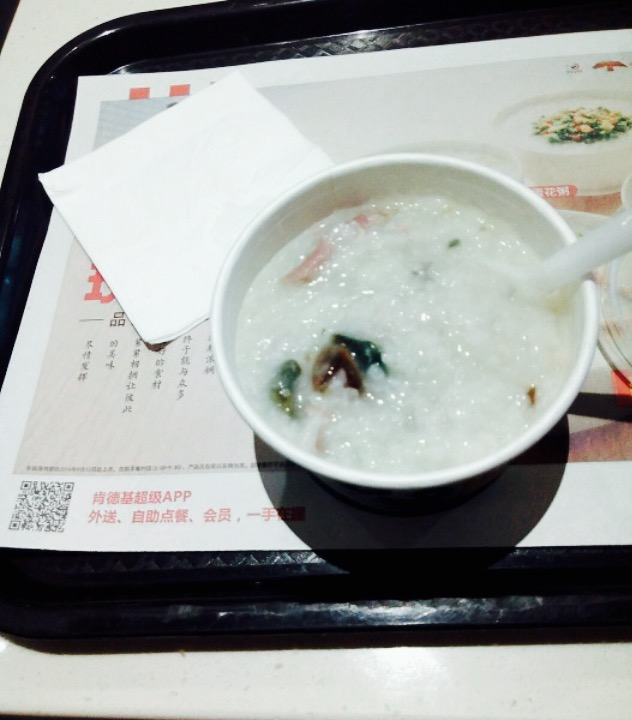住在边上的汉庭,周日汉庭没有早餐就发了旁边肯德基的早餐券。地理位置很好哦,出了汉中门地铁站就到了,吃早饭的人不算多,店里装修的还是蛮好的。早餐券包含的有豆浆,油条,一份粥,还有一个鸡肉芝士堡,量是好大,一个人根本吃不完。好久没吃过油条了,觉得肯德基的油条不错哦,豆浆的味道也很好,应该是现打的。鸡肉芝士堡我就感觉一般了,就吃了两口。最后尝了几口粥,真的吃不下了,可是味道还行。