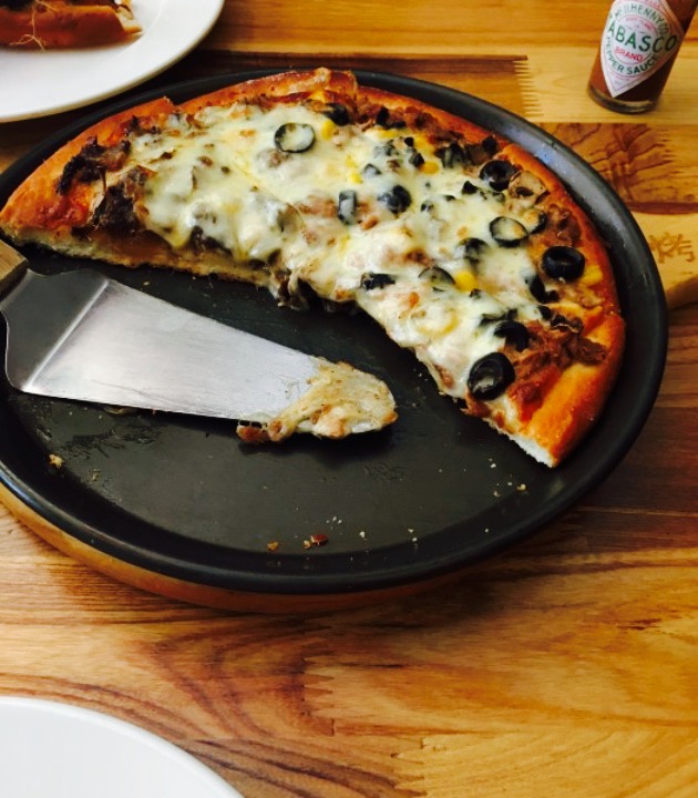 我们没有点饮品,卖家送的茶说是可以减肥,有种荞麦的味道口感比较细腻很好。最爱的披萨来了