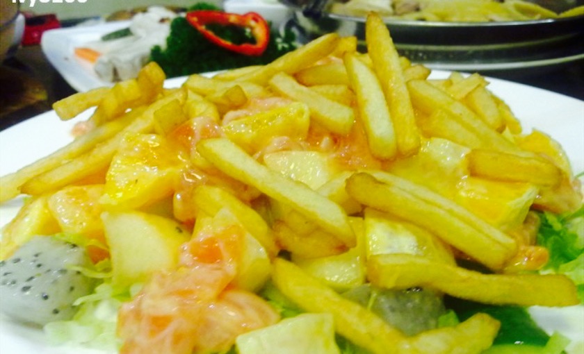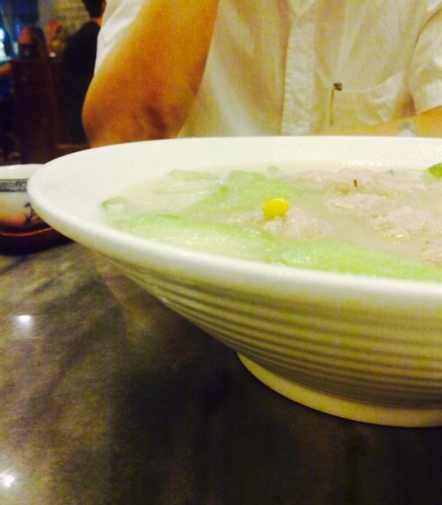 第二次到他家用餐了。他家位于有些内里的汾江南路131号丽日豪庭商业街1楼,靠近惠景中学。若不是熟客或经人推荐,一般初次很少会想到到他家来喝茶吃饭吧,他家貌似以做街坊熟客生意为主。味道好,不愁没有回头客。入口门面不大,进门左手对着楼梯,楼梯脚旁是一座小型假山和一个小号锦鱼池。一楼,二楼都是大厅,包房设在三楼,从一楼有电梯直达。包房不是很大,不过配套齐全。有红木沙发桌椅,餐桌也是实木的,非常厚实,包房透着中国风。有液晶电视和独立卫生间。要了一壶普洱茶,60元/壶,茶具清雅,茶香四溢。碗碟也是好看的陶瓷,尤其装盛炖品的炖盅,黄底蓝色的飞龙,透着皇家气,很是夺目和贵气,与房间的布置相得益彰,浑然一体,显得高贵,幽雅。他家菜色除了个别不尽人意,大部分味道可圈可点。炖盅,好看的炖盅是炖肉丸,大大颗的狮子头,清淡入味的汤,适合这个晚春的时节。炖盅后首当其冲是拼盘,其中的烧鹅肥瘦适中,烧鹅皮油光发亮,香脆,鹅肉入味可口,是下酒送饭好菜。清蒸边鱼,普普通通的一条鱼蒸出了好味道。鱼新鲜,火候掌握较好,酱油咸淡适中,美味可口,应是自家调制的酱油吧。南瓜香芋芡实煲,红色和白色搭配,舒适的菜色。芡实煲得够烂,南瓜和香芋也粉,空口吃觉得更香。鲍汁腰豆,主人说是次次必点的菜色,尤其喜欢其中的腰豆。腰豆透着亮度显得新鲜,口感和味道俱佳,另外还配了一丝的蹄筋。但据说酒店选用的腰豆一般来自罐头食品,味道都是调制好的。若是这么,就不算是健康食品了。蒸茄子,卖相不俗,重点是造型非常。好吧,茄子蒂木有摘下,茄子开了几刀但连接着紫色的蒂,茄子扒开“坐”在碟子上,蒂朝上,高扬的茄子蒂犹如猎猎旌旗,有些意思。茄子够烂,调味也好,挺受欢迎的。鱼饼豆角,外皮煎得有些焦黄的鱼饼,扒在豆角上,嫩绿的豆角卖相很好,新鲜脆口。鱼饼鱼味很浓有弹性,相信掺粉不多,咸淡适中,也是下酒送饭好菜。炒红薯叶,真心说,这个青菜选料一般,不是特别嫩绿。是被雨打的吗。用餐时外面正下着瓢泼大雨呢,呵呵。麦包,卖相一般,口感也一般喔,面有些粘牙,馅料是花生和椰丝等等,好甜并且有些粗糙,感觉是吃过的麦包中极其一般的。还有其它的菜,就不一一列举了,以清淡为主,吃得好撑。他家服务响应较好,性价比总体中上。
