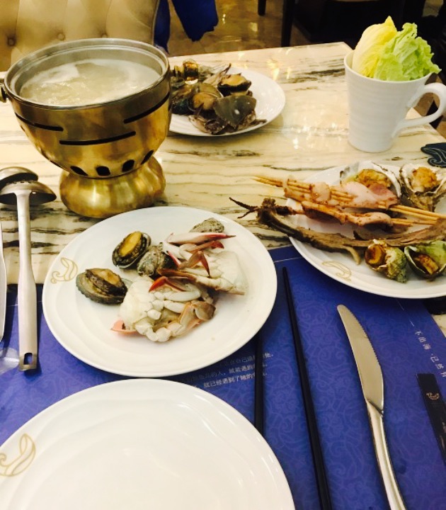 不出海享受新鲜海鲜。先来上点新鲜还在动的鲍鱼和罗氏虾放在沸腾的高汤中翻滚,不一会起锅开吃