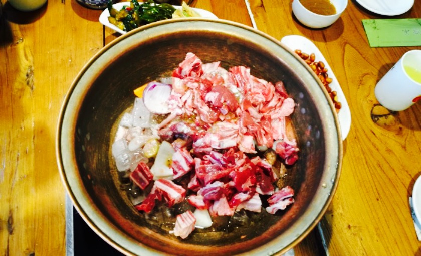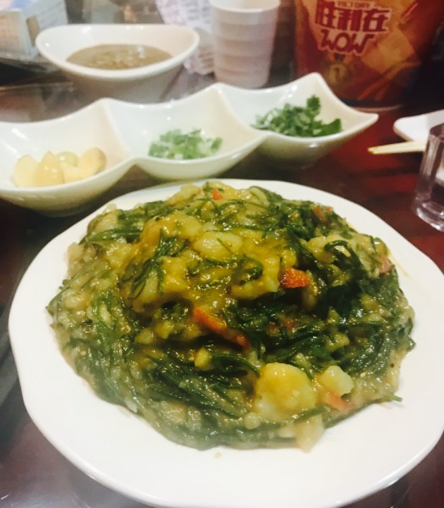 在北京吃过类似的,细节还有些许不同,先倒入冰块,待配菜主菜都放入后,还要倒入酸奶,红酒以及白酒,大约等15分钟后就可以吃了,刚开始羊肉还有点硬,多煮一会儿羊肉会越来越软,肉质新鲜,不柴,很香,很特点的吃法,值得一试。麻酱味道也不错,稍微有点辣,却也恰到好处,不够还可以免费加,很亲切,当地人很淳朴,服务态度也好,点赞。