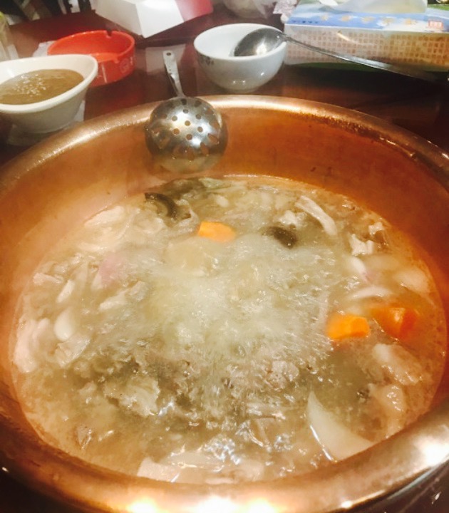 跑完马拉松回去路上看这家评论不错,就下车试下,现切的羊肉,下边是冰块,洋葱和姜铺上羊肉,浇一勺酸奶,一勺红酒,一勺酱汁,一勺枸杞还有些药材泡的汤水,就盖锅开煮,吃起来肉挺嫩的,蘸上他的秘制酱汁味道不错,不腻也不膻,吃完肉涮了点香菇和生菜,饱饱的,接待的麦茶很好喝,服务也很好,整体性价比不错,我看团购四人餐也就一百多,我们没有团,自己单点两人一斤肉配些菜一共99也很合算。