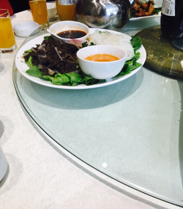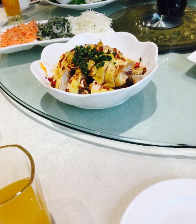 很不错的一个地方,位于长江路淮南街,向南路西。一楼虽然看上去不咋地,但是二三楼装修的挺好看的,稍微感觉豪华了些,三楼走廊让人看了就想照一张,三楼大厅最有特点的就是它的房顶,算是个好几块的镜子做的,昂着头就能看见其他人在干什么,比较清楚,对颈椎还好,但是看的人可都是倒着的哦。不过三楼的厅显得有点小了,实际上不是太小,坐了七桌人,满满的,然后就坐在里面的人上卫生间出去办事就不合适了,显得拥挤。上菜速度感觉老慢了,也或许是客人未到齐的缘故吧,可是一但开始上菜,那速度就快了,一道没吃完,又来两道,最后盘子叠盘子,不过该吃的入味的我们都在上下一道菜前吃的大同小异了,而且菜量确实很实惠,非常多。关于凉菜,一个土豆泥还不错挺甜的,形式也很好看,不过人多菜少,一份才五六块,一桌十来号,对不上号,正好有些人不吃,最后还没吃完,关键是一块有点多,块数有点少。但是的确很好看。另一道菜据说是驴肉,吃起来很不错,可口,肉香。还有一道是生毛肚和百叶吧,没吃完,挺适合年轻人吃的,一般人吃不习惯,挺辣的,爽口,绝对的。虾尾和炸的虾头是一盘菜,虾尾不太美味,有些腥,只是吃完了竟然,虾头炸的热乎的,没人动,个人感觉更入味一些。关于热菜,娃娃菜大家都说不错,可是里面的粉丝吃完了,菜头倒没人动。甲鱼几乎没人吃,里边的大拉皮倒也是吃完了,我们这桌是专门来吃配菜的吧。烤鸭上得有些慢,而且有点烤糊了,肉少饼多,肉算是吃完了。另外烤鸭的葱丝也有些少。鱼,是中华鲟,想都不想认为是家养的那种,不是太好吃,沾着里面的酱油勉强可以接受,几乎没人动,两个硬菜,白馍加肘子和一个烧饼夹的菜我忘了,烧饼的那个全吃完了,肘子是一整个,有个人动了一筷子,我也动了一筷子,不是太好吃就没动了,重点是太完整了,撕不开拿不动,汤最后上的,大概是一甜一咸,西湖牛肉和银耳吧,我没动,因为菜太多,早就吃饱了,其他人但是喝了好多。对了,还有大包子和香菇包子,大包子太大了没人动几乎,都是被老太太们临走打包了。香菇包实在是按照香菇的样子做的,只是里面是肉馅的,也挺好吃的。一上来几乎好奇的人都吃了一个。是个很实惠的地方,在这附近也算是很上档次的地方了。标价也很合理。