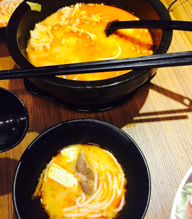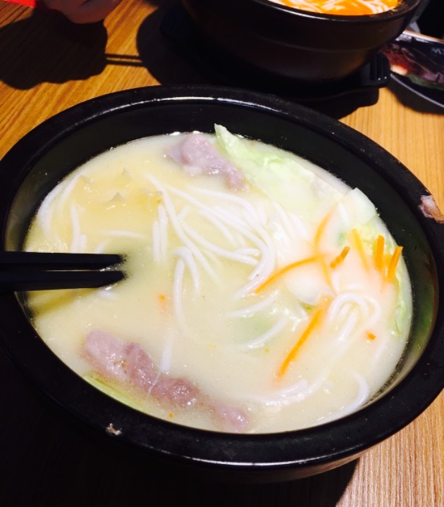 周日和盆友过来吃的阿香泡菜肥牛米线和过桥米线,觉得不错,还送了三张5¥。代金券,任意消费一份米线即可以使用呢。今个晚饭没着落,想来想去还是有点想吃泡菜肥牛,奈何又想吃过桥的鸡柳(好贪心??),坐下才发觉,可以加料??泡菜肥牛米线+鸡柳,美妙,鸡柳要放米线泡一会哟,因为急着吃的偶咬了一口,冷的??泡会就好了??好吃??米线里有肥牛,泡菜,豆腐(晚一点吃会比较可口哦,),蔬菜,还有四片午餐肉,料很足,炒鸡喜欢米线里的毛豆,好次,有机会尝试一下其他的??。