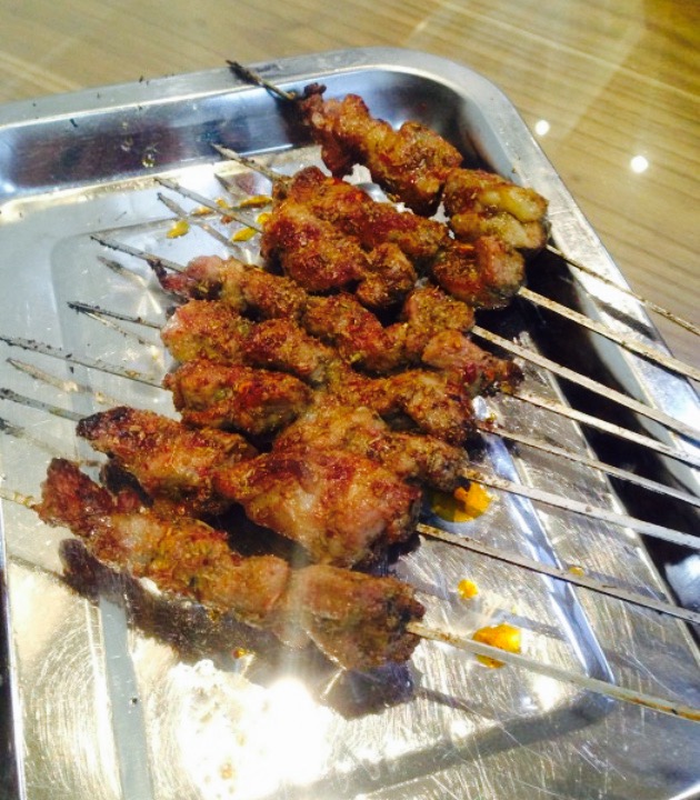 烤肉撒的辣子感觉味道怪怪的,肉很大块,要的烤筋,焙得不够干。糖蒜一份很少,但是可以再取,不加价