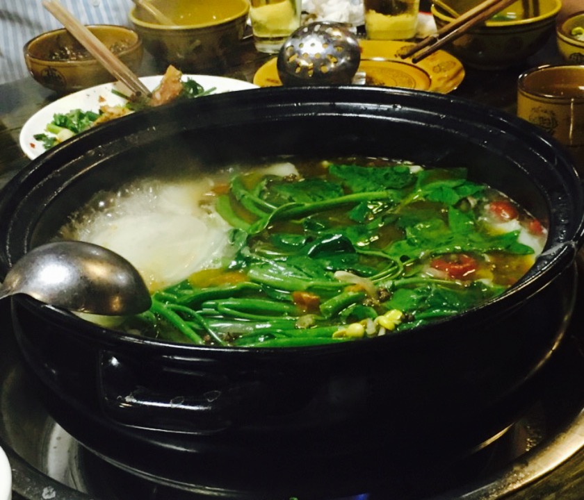 天气实在是太冷了 。觉得吃个汤锅暖一暖身子 。因为上次来过一次就想着再来试试 。位置 。特别好找 。就在大同路上啊 。一个2楼的隔间里面。环境 。 。木桌子和木椅子 。餐具也很特别 。给人觉得还是挺卫生的。口味 。是那种黑色的砂锅 。份量也不错 。三个人吃个小份就大同小异了 。汤应该是排骨汤 。很鲜 。最重点是烫的菜非常特别好吃 。吃惯了重庆麻辣火锅 。偶尔试试别的口味也不错哦。