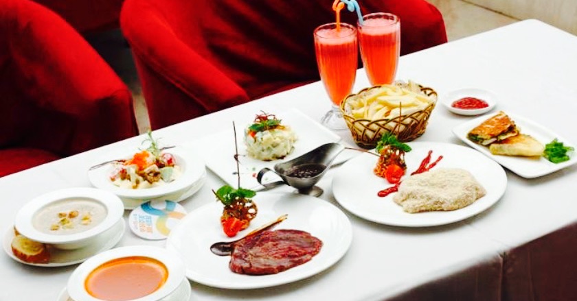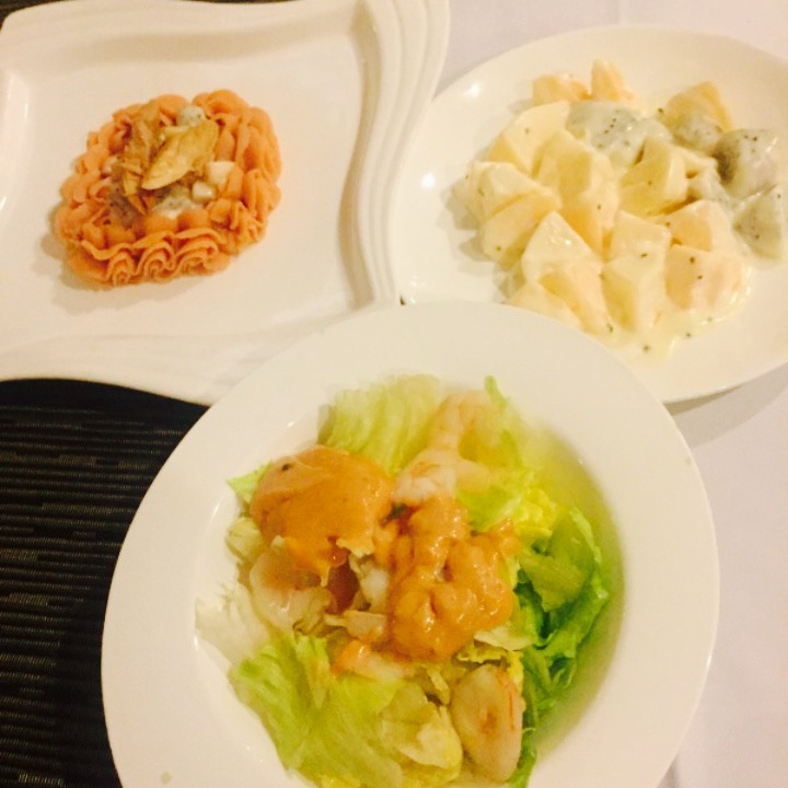 周末相约闺蜜团,三人来拔草,酒店感觉高大上,去的时间比较早,店里几乎没人,有点包场的样子,三人餐188,跟着闺蜜来体验洋气的西餐。西瓜汁,中规中矩。沙拉,有三份,其中一份被我认作成方便面,实际上是金枪鱼土豆泥沙拉,味道都一般。三份汤,我尝试的奶油蘑菇汤,奶香味不足,没啥特点。牛排,唯独最美味的就是牛排了,两份牛排,黑胡椒汁味道很赞,牛肉的肉质也好,七分熟的口感刚刚好,还是比较推荐的。披萨,火腿感觉很低端,真心不开心。最后的面包诱惑,那个奶油真心不是太好吃啊。总结一下,188的价格倒是还可以,不贵,可是菜的口感真心一般般,菜品和酒店的高大上有些不搭调,要求不高的来吃吃还是可以的,毕竟不是太贵,足够吃饱。