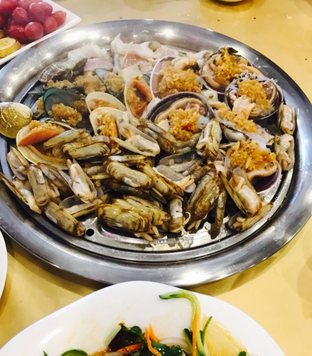以前在双桥路就经常去吃的一家店,现在搬到了民航路城投大厦。海鲜种类很丰富,而且特别清新,所有活物都是养在门口的池子里现点现蒸,因此吃起来特别鲜甜。虾上桌的时候还活蹦乱跳的,贝类很卫生一点沙没有。海鲜蒸着吃,健康又营养。锅底是粳米和虾仁,吃完蒸海鲜再来一碗无比鲜甜的海鲜粥,真的太满足了。除此之外还有好多特色菜也很棒,像广式香肠和腊肉,湛江鸡,陈村粉等等。