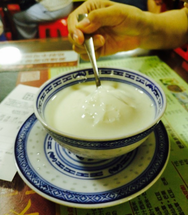今日终于来到了最近网友疯传的位于江华路的赵记了。只见远远就见门口排起了长长的队伍,走近看就更多人了。在等了大半个钟头后终于等到了。一坐下就是点了这个很出名的红豆姜撞奶,还有也是比较知名的卤水鸡爪。上菜比较快,只见服务员先上两个碗,一个装红豆,一个装姜汁,在放姜汁的碗上面上下上下的浇上牛奶,最后盖上盖子等三分钟,再放下另一个碗的红豆就行了。觉得冬天吃这个真好呀。吃的时候,奶刚刚结,暖暖的,又有点姜特有的小辣,吃完整个人都暖起来了。不晓得是不是人多的关系,总感觉我们的卤水鸡爪没有其他人的漂亮,比较干,不过味道还是不错的,还是可以推荐给大家。