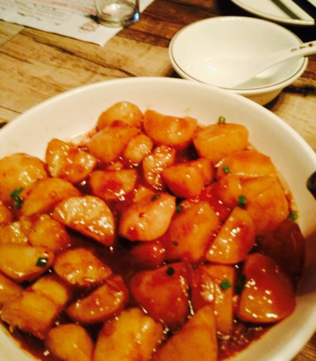 拍照技术渣渣的,环境很好,宽敞整洁,个性时尚。各色水晶灯,拼皮椅子,复古地砖,浓浓的美式乡村风。板栗牛筋68一份,份量适中,味道满分,板栗颜色鲜亮,口感甘甜,牛津软糯又筋道。油渣做的菜还是第一次吃呢,居然挺好吃,配上辣椒一起炒,竟然有点爽口。猪肺汤不做评价,本身不喜欢吃猪肺的话就不要尝试了,我老公说很鲜,好喝。可是在江苏待的久了,口味清淡了,吃着整体都偏咸,尤其鸭头,要齁死了,吃完狂喝水。