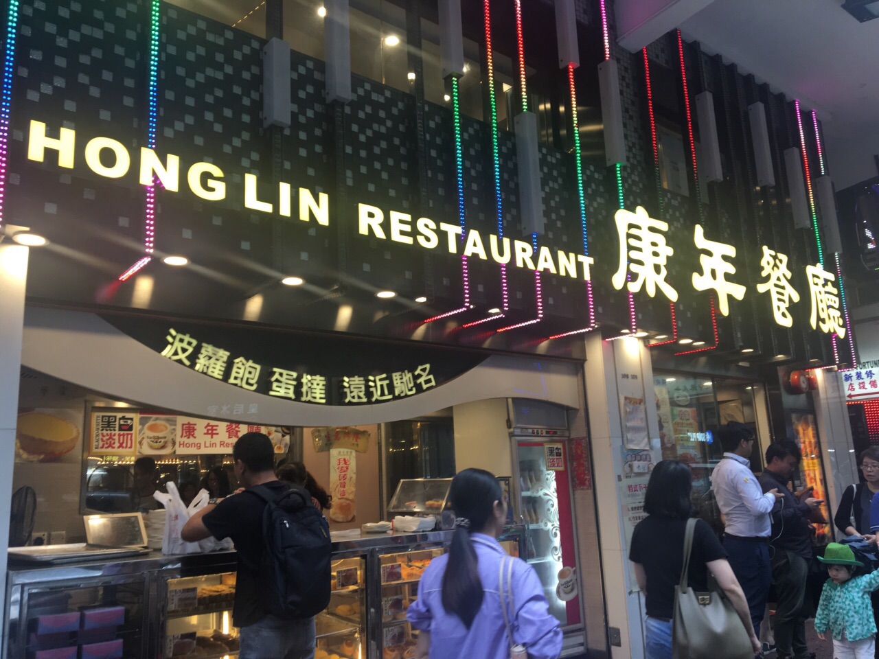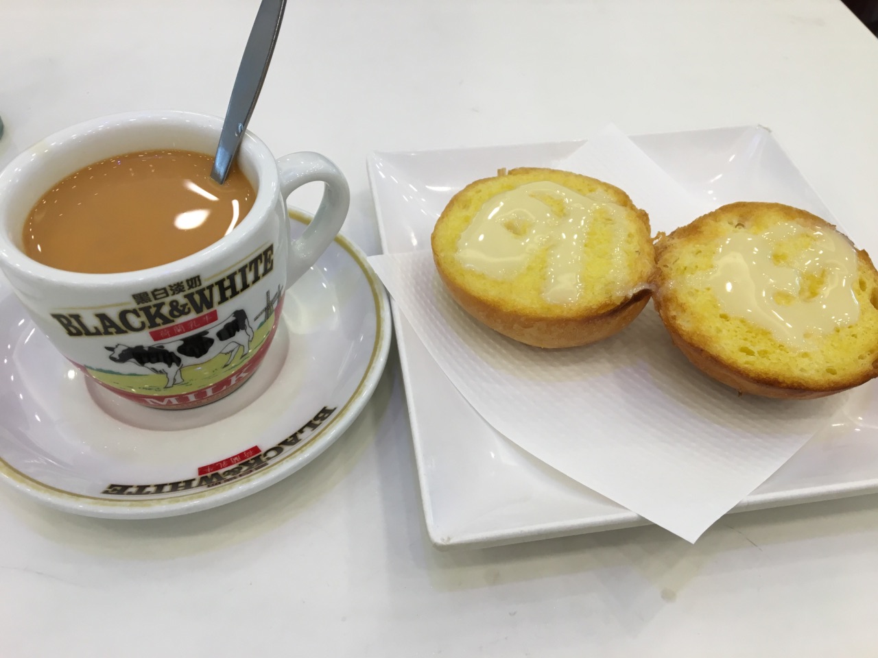 康年餐厅的规模在西洋菜南街上绝对属于佼佼者了,一早来的当然也就没有点正餐,而康年的早餐其实是相当受欢迎的。一杯招牌的黑白淡奶,配上一份奶油猪,面包对半剖开烘的脆脆的,抹上奶油,香喷喷。康年的菠萝油也相当知名,下次来尝试