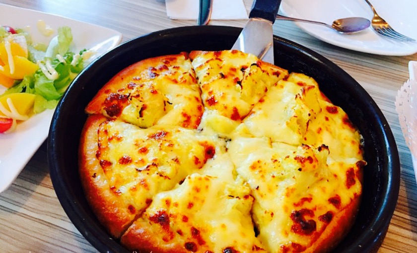 必胜客的家乐汇店自打开业,今天是第一次去,环境觉得不错,没有兴隆的人那么多,不吵,服务生态度也不错,说话也是软软甜甜的。原本是想啃个四拼披萨解解馋的,结果被告知家乐汇店的料不全,于是乎点了潮鸭披萨套餐,海鲜烩饭,然后开启了另一个世界。先说潮鸭披萨,鸭肉片很薄,配着葱丝和甜面酱,外加马苏里拉芝士,还有必胜客特有的香香的面饼,口味一点也不和谐,有种啃当年学校门口掉渣烧饼的样子。饼皮实在是太厚太厚了,曾经迷过一阵薄底菩萨,脆底披萨,阅尽千帆之后,还是觉得必胜客的面饼最赞,如果是吃四拼,PO主可以把边边角角都吃了,因为脆脆的的确很香,可是今天吃着有点难吃,面饼一厚,感觉发的也不是很好,也不怎么香了,重点是葱丝和甜面酱,太黑暗的搭配了。海鲜烩饭,仍然是很爱,很爽口很入味,必胜客最爱没有之一。韩式炸鸡,跟着套餐点的,一看外面挂的浓浓亮亮的浆,就一种甜腻感让人不想吃了,所以没动,老公作为炸鸡爱好者表示下次还是烤翅吧。土豆沙拉,培根粒很大,给的也好多,好入味。其余就是无功无过。