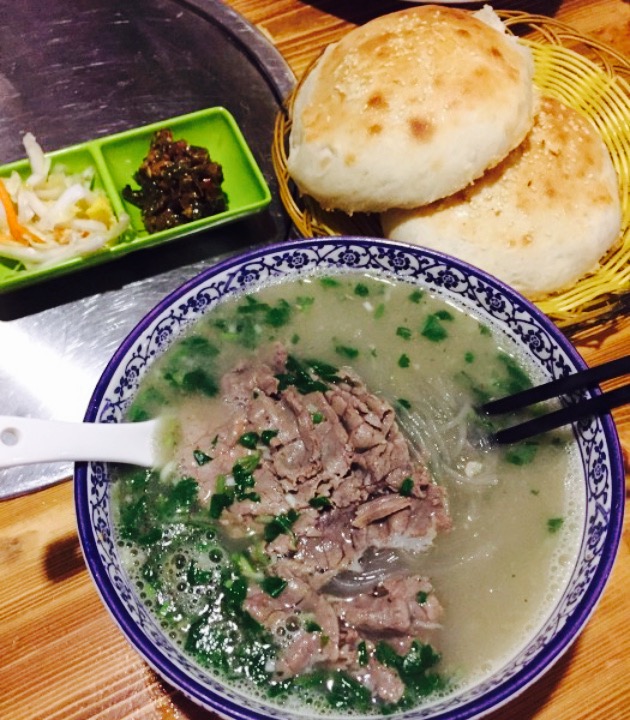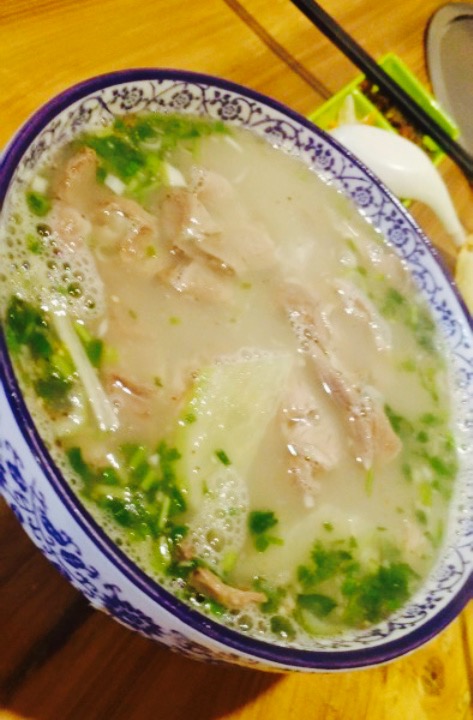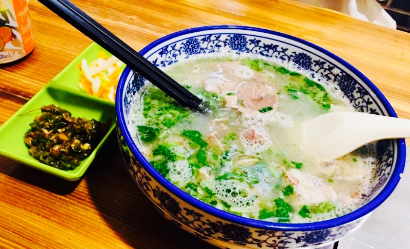 晚上住在羊汤客旁边的大酒店,很晚才下楼来觅食,隔壁找了一圈,感觉这里计较干净,而且顾客很多,说明广受大家喜欢啊,因此就选他家了。刚来的时候都没有位子,很多顾客都站着等位,走一桌占一桌,生意十分红火。排到我们的时候已经9点多了,点好餐再排队等羊汤和烧饼。这个烧饼非常有特色,现烤出来就得现吃,凉了就不入味了,烧饼的外皮脆脆的,里边是发面的,吃起来热气腾腾外脆里嫩,还有微微的甜甜的。羊汤的分量也很大,每份的羊杂都好多,粉丝也好多,一个人吃的饱饱哒。