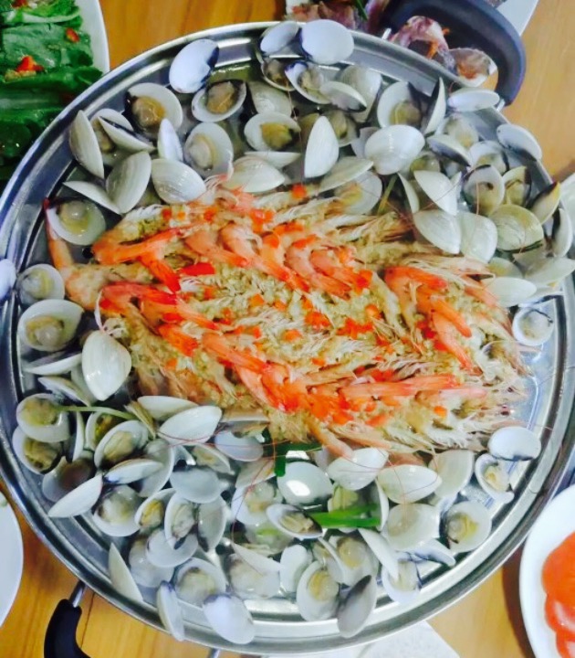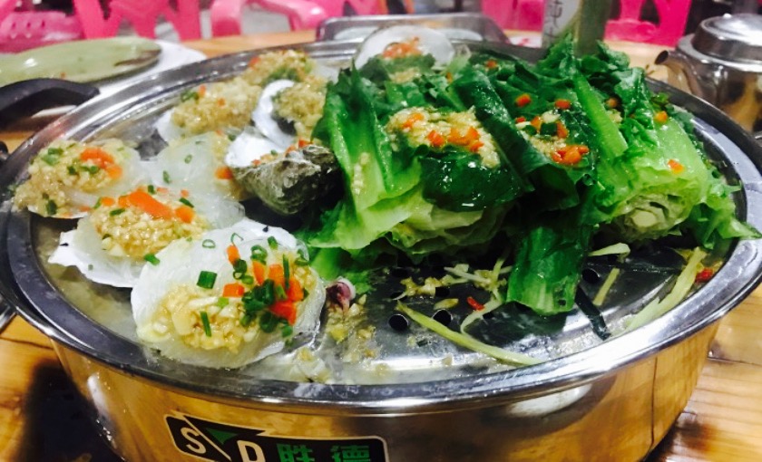 应该是离小区最近的食堂了,吃了几天海鲜大排档以后很想换换口味,最后发现桑拿菜是个不错的选择。三个人,要了桑拿虾,鱿鱼,蒜蓉粉丝扇贝,生蚝,娃娃菜,油麦菜,金针菇,红薯,还有一份白切文昌鸡。第一次尝试这种做法,觉得很清新。大圆桌中间摆了一个大蒸锅,吃的时候上面铺一层蔬菜,蘑菇加一层海鲜,蒸熟后蘸蒜泥,辣子,金桔和酱油汁,清新不油腻,蔬菜吸收了海鲜的浓香,特别鲜美。和油麦菜比起来娃娃菜更适合这种吃法,金针菇和鱿鱼也很赞。吃完蒸菜后里面可以下面。除此之外白切鸡也蛮嫩的,就是菜量很大,人少点菜需谨慎,饭点很忙,点菜什么的都是自己往菜单上写。