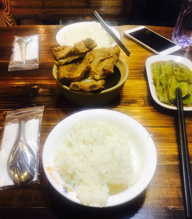 位置就在中山路百盛后面的湖北路上,门头很显眼。内部装修的有一点复古风格,环境很好,吃饭很舒适。中午当做工作餐点的脊骨砂锅米饭,味道很不错,肉很嫩,很容易咀嚼,汤也很入味,3块脊骨的量对于姑娘家的胃口足够了。