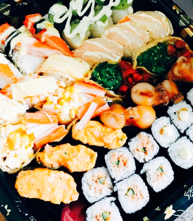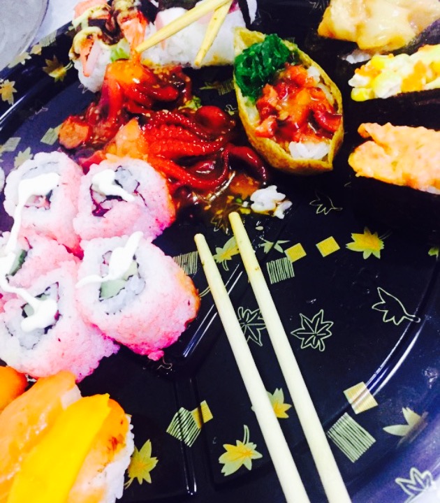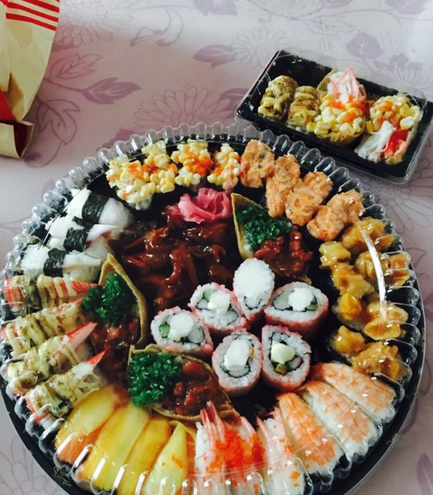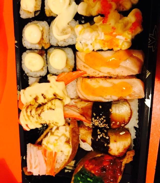点了一个48的单人餐,送餐小哥态度特别好。寿司现做,要提前一个半小时订餐,寿司饭的部分不错,松软的不过不会散,拿到的时候还是挺漂亮的,盒子被我颠倒了一下沙拉酱糊盖子上了才成了如图的丑样。芥辣是那种一小包的,还是特别辣的。要是有自己磨的山葵就完美了。当然这点对外卖来说可能有些难。
