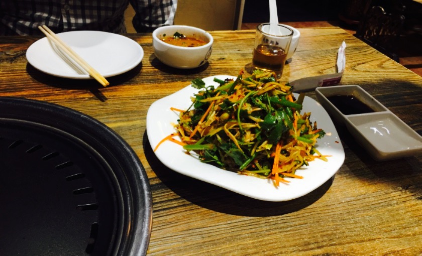 咸水沽一家不错的烤肉店,就在水岸华庭饭店一条街里面,有双人套餐,客人好多,装潢风格类似东北农家院,烤盘很大,就是吸烟烟鲜果不是很好,水煎牛肉肉质细嫩口感不错,都是提前腌制好的,里面还有洋葱之类的颜值配料,很有味儿,佐料是自助式的,根据自己口味调制,还有各种凉菜和粗粮主食。整体来说还可以,觉得性价比是挺高的吧。