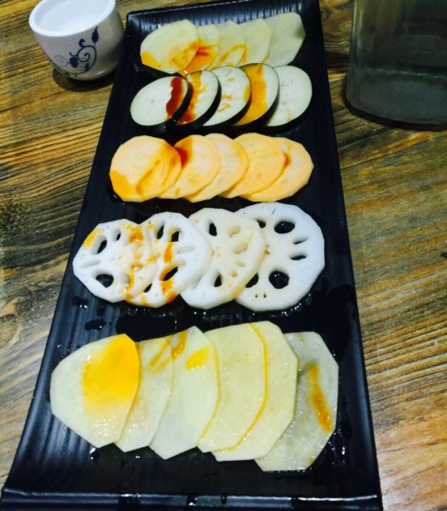 还是烤肉最美味,炸蔬菜必须要赞一个,比以前吃过的炸蔬菜都要好吃,菜的块头很大,并且还炸熟了,红薯很多
