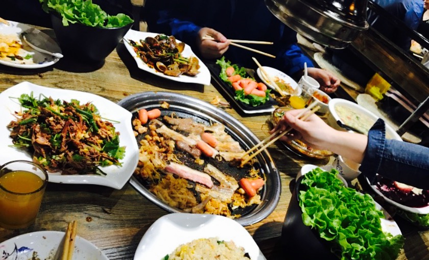 离咸水沽近,庆祝老大晋升选的这家,原本以为是一家韩料馆,其实画风是“最炫民族风”感的东北烤肉餐厅,嘿嘿,性价比还是超高的,四个人吃撑了人均才50,他家以烤肉为主,各种烤肉都可以尝试,鲜拌牛肉,羊肉等等都试过了,肉还是很嫩的,而且油烟并不大,还有烤洋芋,茄子等等,还是烤肉最美味,炸蔬菜必须要赞一个,比以前吃过的炸蔬菜都要好吃,菜的块头很大,并且还炸熟了,红薯很多,很和我们的胃口,还点了凉拌海草和蓝莓山药,中规中矩吧,南瓜饼也一般,还是烤肉和炸蔬菜最美味,服务员偏忙,整体来说性价比很赞。