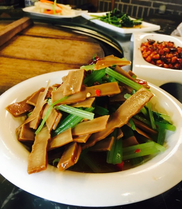 ...和红椒,很解腻,农家凉皮很结实,烤牛肚劲道可口,煎饼卷菜炒鸡入味的,饭菜质量都很高,菜量也很大