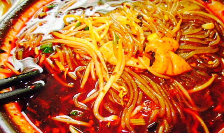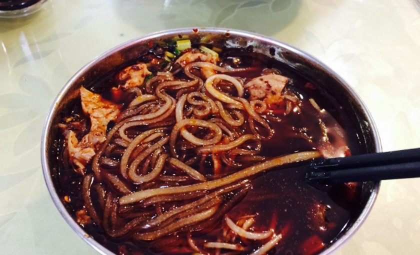红红的辣椒油闻起来非常香,肥肠粉经丝也还不错,长长条条看起来还比较透亮,放进嘴里很顺滑,麻辣味...
