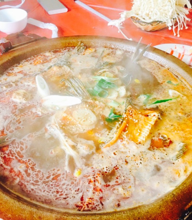 威海天沐温泉对面,按照地图走,位置很准确。虽说很偏僻,只是人挺多的。实际上味道还好,可能只是要的微微辣,如果要中辣会很美味。价格巨便宜,98,6斤多的大鱼,鱼肉片下来炸,鱼排做锅底。鱼肉最好也放到锅里涮涮很爽口。各种配菜量大到飞,真是实在的一家店。